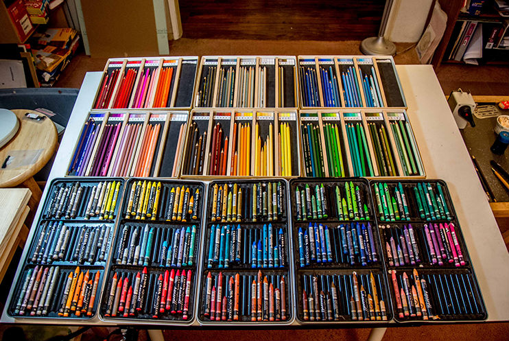 I paint with my collection of Caran d’Ache Neocolor II and Lyra Aquacolor artists' crayons, and Prismacolor colored pencils.