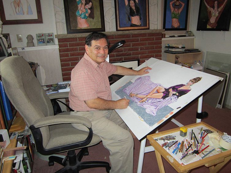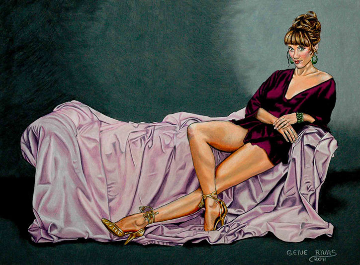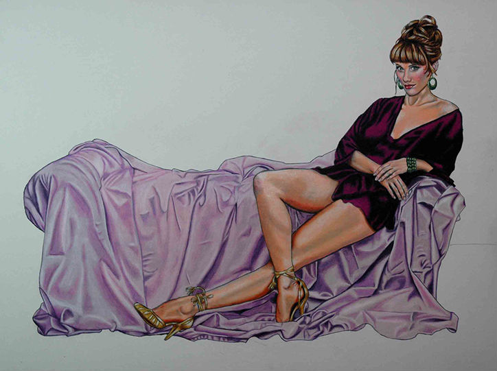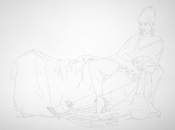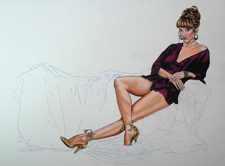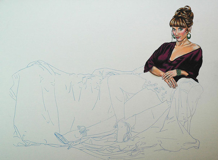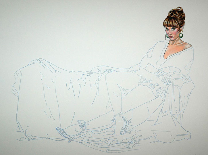 Step 1: Draw the layout and most of the detail. In this case, I worked from three photographs. I turned the head, re-drew the blouse, shortened the love seat and simplified the sheet.